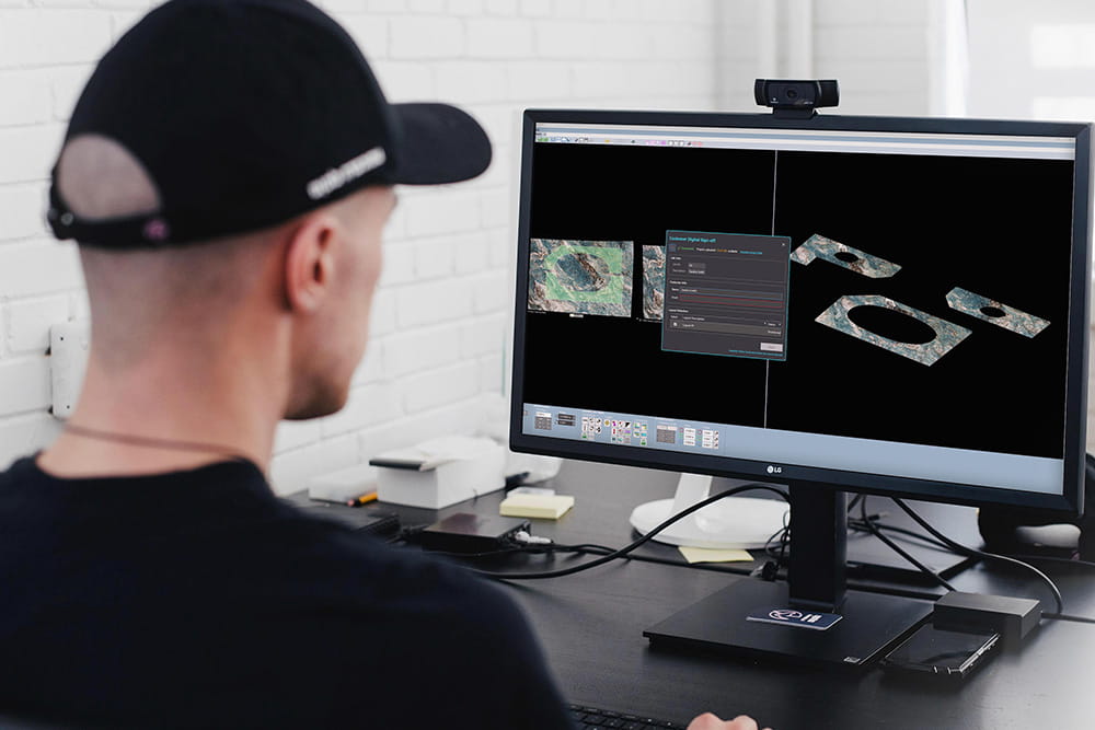 AR removes the guesswork by showing the stone directly in the kitchen or bathroom. For remodels, the new layout appears over existing countertops. For new construction, it can be placed on empty cabinets, helping customers clearly visualize the finished space.